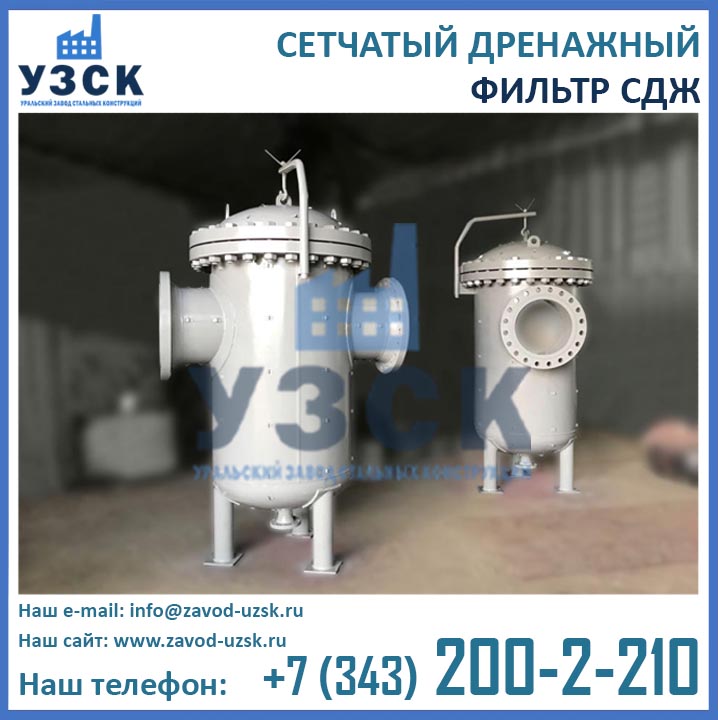 На формирование цены дренажного фильтра влияют следующие факторы: материальное исполнение, конструктивное исполнение, стоимость сырья в момент изготовления, комплектация, необходимость доставки в другой населенный пункт, срочность выполнения работ по изготовлению, прочие предпочтения заказчика. Уральский завод стальных конструкций изготавливает фильтры СДЖ-700 любого типового исполнения, а также нестандартные фильтры СДЖ 700 мм по чертежам заказчика или техническому заданию. Дополнительно к фильтрам СДЖ у нас Вы можете заказать сменные фильтрующие элементы любой тонкости фильтрации, ответные фланцы, прокладки и крепеж. По запросу изготавливаем также фильтры СДЖ-К-700 с концевым затвором. Для того чтобы узнать какова цена на фильтр СДЖ Ду700 в Сатпаеве с необходимыми Вам характеристиками, отправьте запрос в отдел продаж завода УЗСК по координатам, указанным в разделе «Контакты».