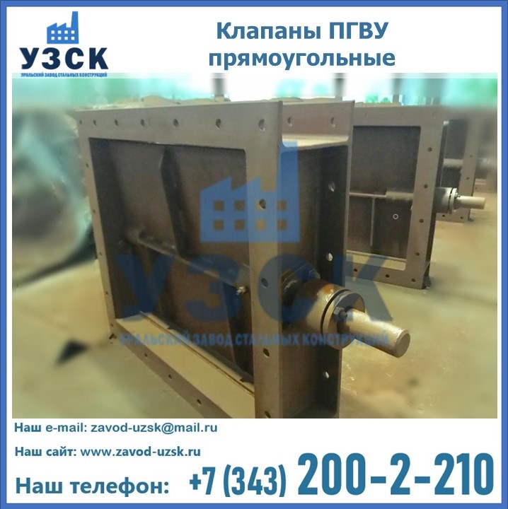 Прямоугольный клапан ПГВУ имеет прямоугольную или квадратную форму, по основному сечению конструкции, на которую устанавливается клапан. Для изготовления в Сатпаеве применяются сталь или чугун, в зависимости от модели. Внутри клапана имеется запорный элемент, передвигающийся параллельно общему потоку движения среды. Шибер ПГВУ имеет такую же форму, как и основное сечение. Перемещение створки происходит благодаря возвратно-поступательным движениям.