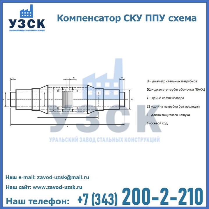 Уральский Завод Стальных Конструкций в Сатпаеве предлагает готовые изделия, а также вы можете приобрести компенсатор СКУ ППУ под заказ. Наш завод располагает всем необходимым оборудованием для производства нестандартных позиций компенсатора СКУ в ППУ изоляции. Завод «УЗСК» предлагает большой выбор качественных и надежных компенсаторов СКУ ППУ, полностью укомплектованных и готовых к эксплуатации. Мы гарантируем соответствие нашей продукции всем требованиям ГОСТ и ТУ, износостойкость и высокую производительность. Наше предприятие поставляет и производит оборудование, имеющее длительную гарантию и большой эксплуатационный ресурс. Если вы хотите заказать сильфонные компенсационные устройства СКУ ППУ или другое оборудование с доставкой, наши специалисты помогут рассчитать стоимость транспортных расходов и организуют доставку товара. Вы можете оформить заказ на продукцию на нашем сайте, для этого достаточно заполнить форму обратной связи.